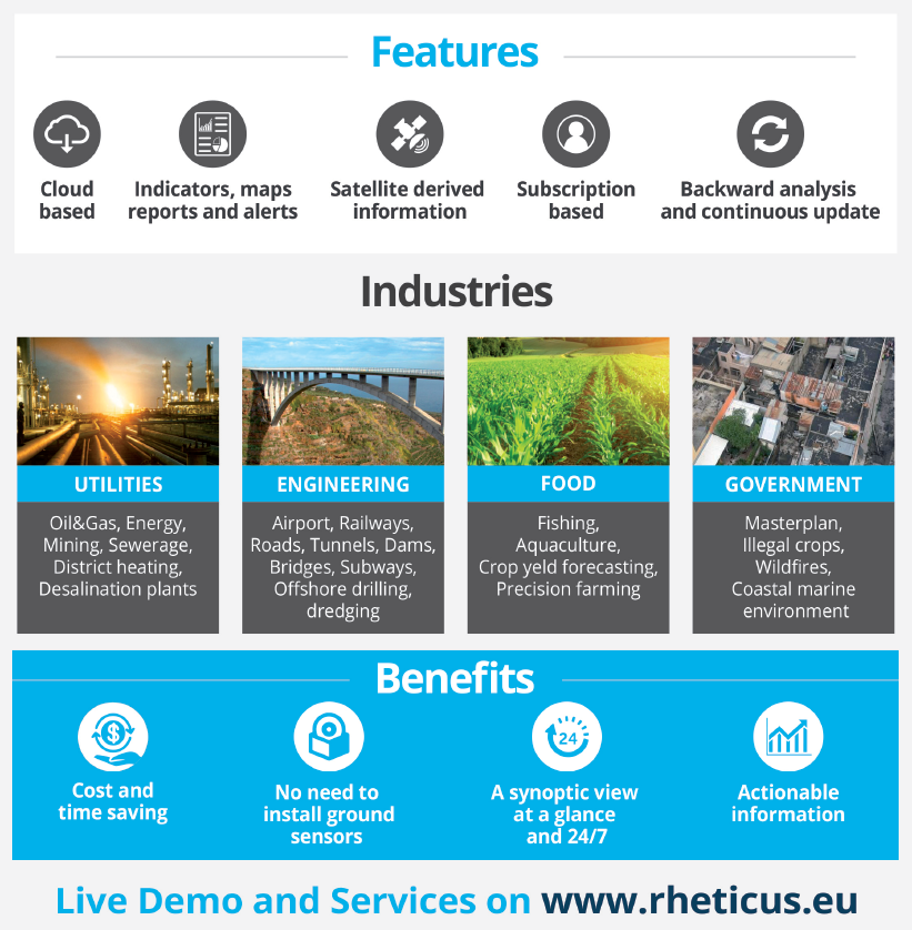 Rheticus® provides timely information that fits the needs of a growing number of business (applications). The information is provided as a service and includes maps, reports and geospatial indexes, designed to monitoring several phenomena.