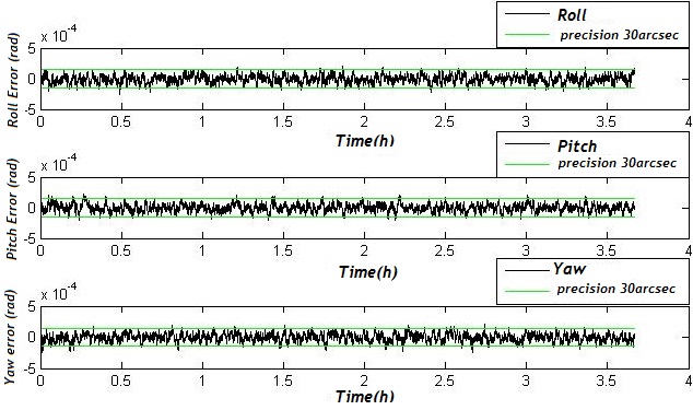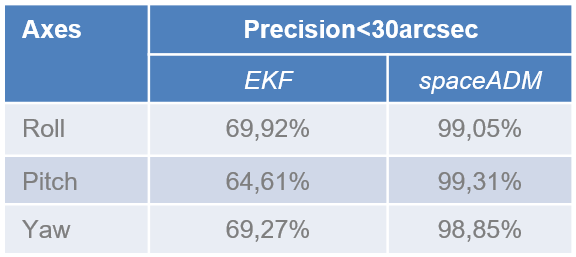 When using Star Tracker data, an attitude error estimate lower than 30arcsec per axis (Roll, Pitch and Yaw) is achieved.