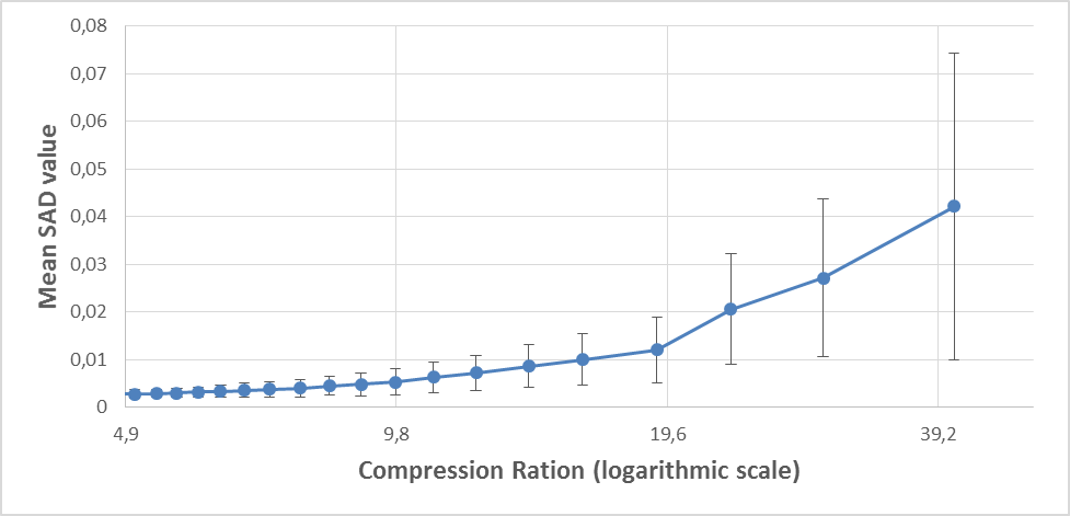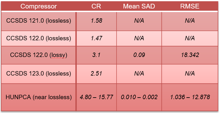 The HUNPCA compression algorithm has been evaluated in terms of data loss according to the similarity metric Spectral Angle Difference (SAD) and the Root Mean Square Error (RMSE). Its performance is compared with the CCSDS 121.0, 122.0 and 123.0 compressors.