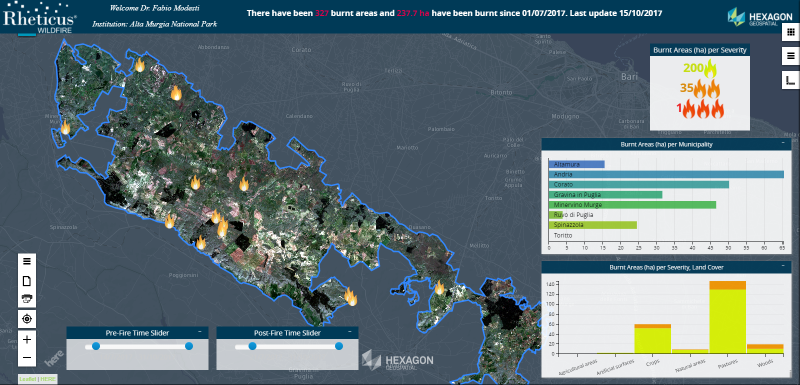 Il Parco Nazionale dell'Alta Murgia è stato il primo utente ad attivare, da luglio 2017, il servizio Rheticus® Wildfires, con l'obiettivo di monitorare meglio le aree incendiate nel corso di un'altra importante stagione degli incendi in tutta Italia. Il servizio ha fornito ai gestori del Parco Nazionale dell'Alta Murgia tutte le informazioni necessarie per sviluppare e supportare le proprie strategie di gestione e pianificazione di recupero, per adempiere agli obblighi di rendicontazione e per superare la mancanza di informazioni utilizzabili. Grazie al servizio è stato possibile anche supportare le attività di organizzazione e di gestione delle priorità per i team di intervento sul campo.