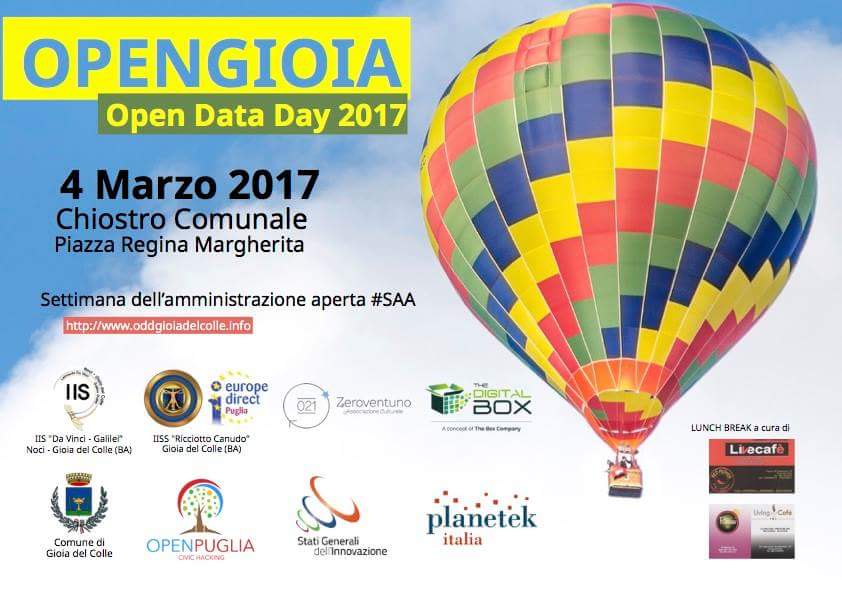 In occasione della settimana dell'amministrazione aperta dal 4-11 Marzo, Gioia del Colle, per la prima volta nella sua storia, sarà la sede dell'OpenData Day. Durante la giornata si parlerà di numerosi progetti e casi d'uso di Dati Pubblici ed Imprese, tra i quali: ASOC - A Scuola di OpenCoesione: DepurAzioniamoci; Planetek Italia: Progetto EUGENIUS; progetto Trip Friends.